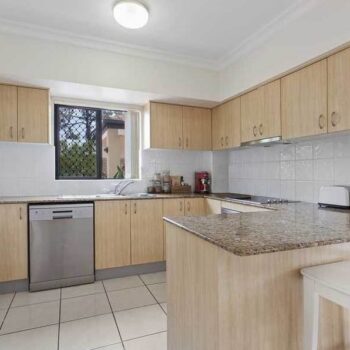 Modern kitchen with granite bench tops, including breakfast bar and dishwasher